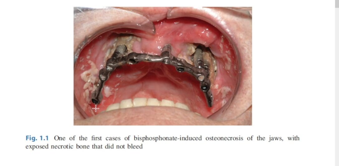 «Менее чем за 10 лет появилось более 1100 публикаций об остеонекрозе челюсти, вызванном бисфосфонатами. 16 организаций подготовили документы, в которых изложены кейсы десятков тысяч людей, пострадавших от этого серьезного побочного эффекта, вызванного приемом лекарств. Бисфосфонат-индуцированный остеонекроз является подавлением обновления костного обмена; хрупкая и часто некротизированная кость находится в областях, где скелет подвергается наибольшему воздействию сжимающих или изгибающих усилий, например, альвеолярная кость в челюстях, или средняя часть бедренной кости. И перед клиницистами задача состоит не в том, чтобы неоднозначно относится к индуцированному бисфосфонатом остеонекрозу (то есть нельзя неоднозначно к нему относиться), поскольку некроз связан с молекулой бисфосфоната как таковой и при этом все другие медицинские состояния и лекарственные препараты играют лишь вторичную роль в качестве сопутствующих заболеваний. Поэтому частота и доза, применение таких лекарственных препаратов, должны быть тщательно управляемыми, а также должна работать команда челюстно-лицевых хирургов и стоматологов для того, чтобы быть в состоянии компетентно лечить таких пациентов, контролировать или устранять заболевание».
