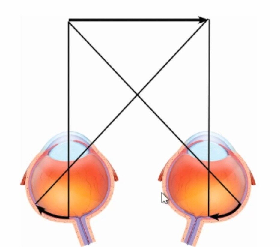 Мы видим внешнюю видимую часть глаза, сетчатку, зрачок, а зона, которая смотрит, находится на задней стороне глазного яблока. И феномен наших глаз в том, что у нас инверсированные зрительные поля. Правый глаз, чтобы видеть, что происходить справа, видит левым внутренним кусочком. А во внешнюю часть глаза проецируется все то, что происходит в центральной части поля. И когда у нас косоглазие, потемнение зрительного поля, то биологически, чтобы выжить, нужно было или не видеть какую-то часть, или очень хорошо видеть периферию. Картинка преломляется через глазное яблоко, через хрусталик, и попадает на зрительный анализатор. И если косоглазие, внешняя часть глаза развернута вовне, то нужно подумать, что важно было видеть, или чего важно не видеть.