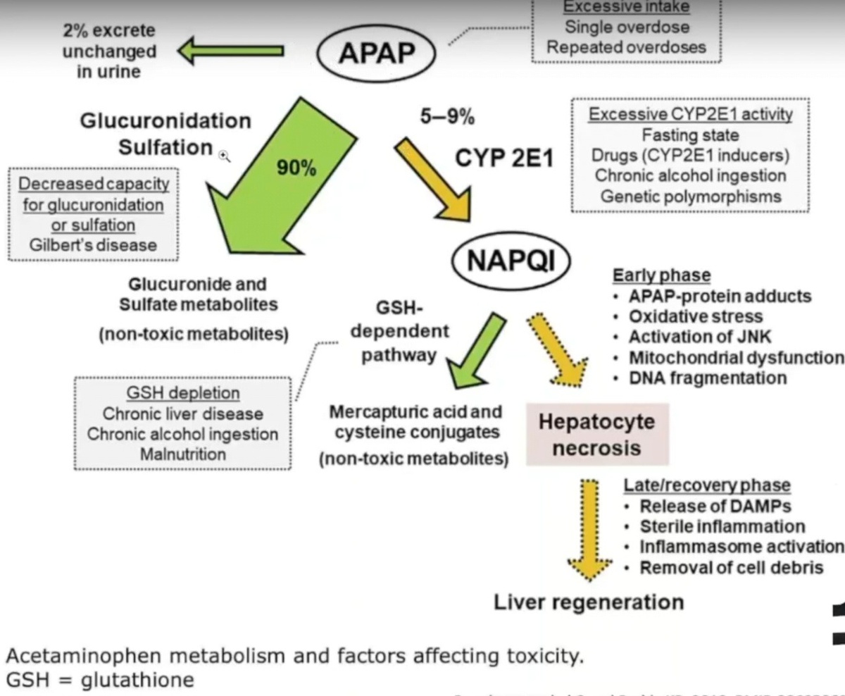 Они выводятся с мочой обычно, то есть попадают в кровь после глюкуронидации и сульфатации и выводятся почками. Глюкурониды и сульфаты ацетаминофена уже являются нетоксичными метаболитами. Дальше у нас от 5 до 9% приходится на CYP2Е1, фермент семейства цитохромоксидаз 2Е1, который формирует NAPQI, крайне токсичный метаболит, который может нейтрализоваться глутатионом GSH. Это глутатион-зависимый путь с образованием меркаптуровой кислоты и конъюнгтиватором цистеина при условии, что с глутатионом все ок. И если с глутатионом как-то не окей, то есть глутатиона нет, или очень активны цитохромооксидазы, могут возникать неочевидные истории, когда поражение печени наступает очень быстро. Это происходит вследствие наложения на парацетамол употребления алкоголя и других лекарственных препаратов. Важно, что постоянное периодическое голодание и полиморфизмы генов тоже увеличивают избыточную активность цитохромоксидаз.