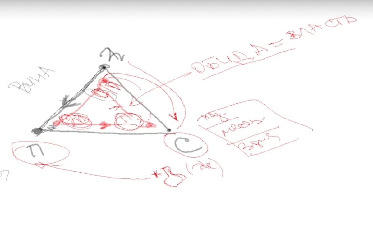 В этих треугольниках мы видим такие чувства: один всегда виноват, а другая всегда обижена. И эти чувства социально взращиваемые, но они имеют разные вектора. Она, получив по лицу, встает в позу.